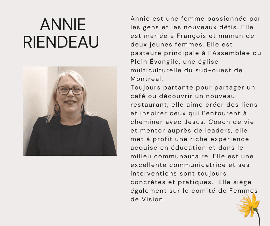Ministre ordonnée des Assemblées de la Pentecôte du Canada, elle a dirigé des ministères jeunesse et de jeunes adultes en Ontario et au Québec pendant plus de quinze ans. Présentement, elle est adjointe exécutive au District du Québec, où elle soutient le leadership et accompagne les responsables d’église dans leurs démarches administratives. Roxanne est également pasteure, mentore, conférencière, leader de louange et coach certifiée des APDC.